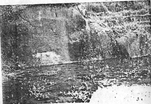 笔者于1958年在汤川人民公社工作期间,为响应上级“大炼钢铁”的号召,除了上山找矿外,还想从“枪刀库”中挖出一批现成的钢铁来。为此请了当地老农引路来到白岩山传说藏宝的地方,看到靠近一条小溪边有一块长方形的巨大石头,露卧在一片荒田中间,石头的两端确有两条约50厘米宽的深沟,被几块大溪石填平;各块溪石都明显地露在外面,结块溶固在一起;在两石连接处.原石好像会生长一样长出石皮,包过溪石几厘米。再经过细心察看,还发现两石的连接地方有一个朝天的小孔,用芦苇秆插进,能捅到几十厘米深。