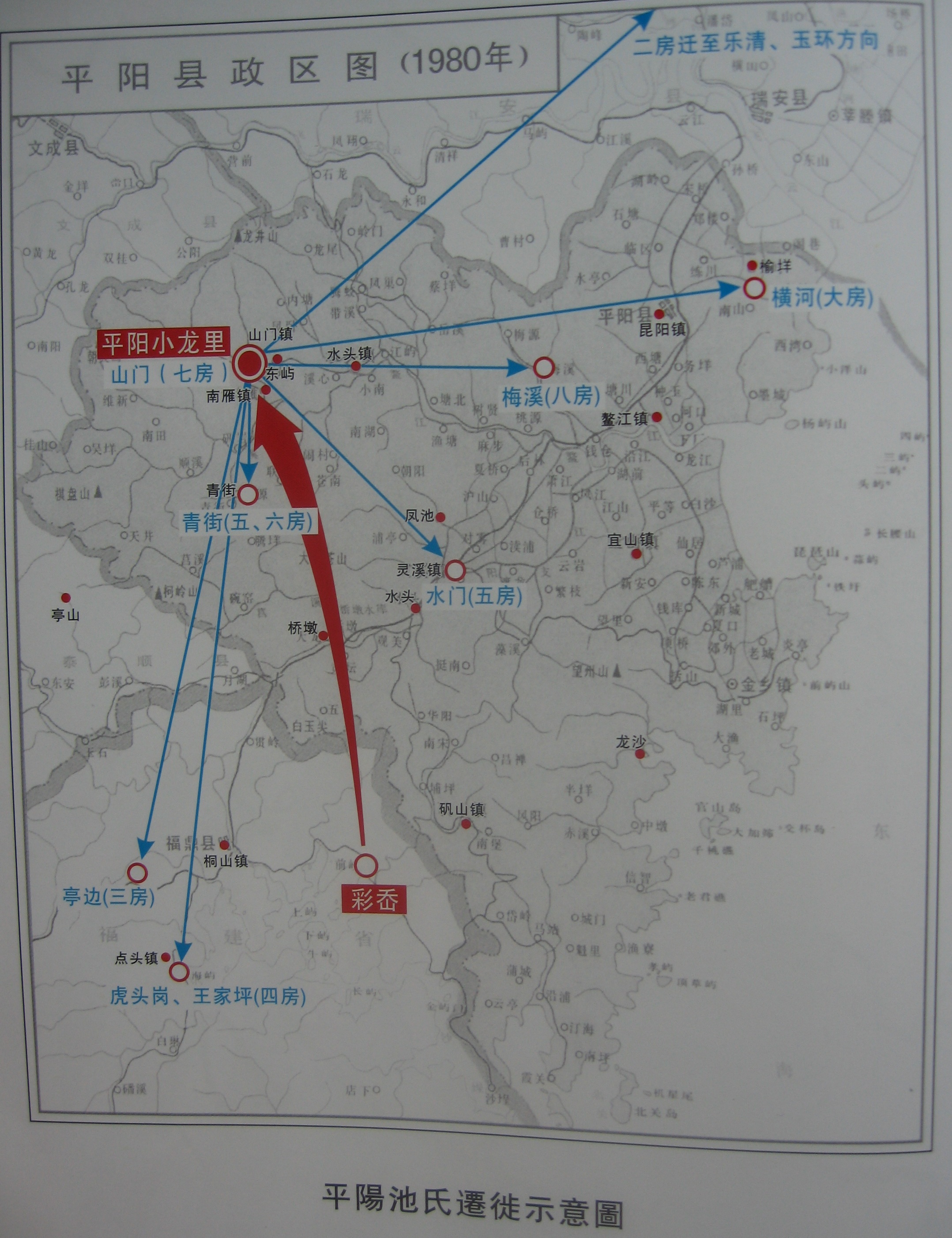 文字说明请参考:公元一九九二年平阳《池氏宗谱》迁徙简述(池云亮撰)