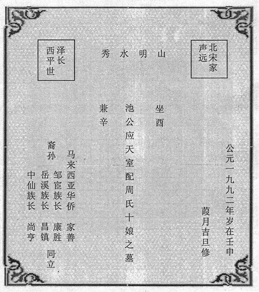 应天公,号十公,开基尤溪二十都邹宦;娶妣周氏讳十娘;生一男,名明时,号十六公。公妣合葬二十一都华阳西坑宫(又称西鸾宫,即泰山庙)。巍巍荡荡,上格苍穹;开基邹宦,阴后无穷。又作诗而赞曰: 鹤群雁阵散分飞, 翔集高岗带日晖, 瑞霭古枝生万叶, 祥麟彩凤恋崔巍。